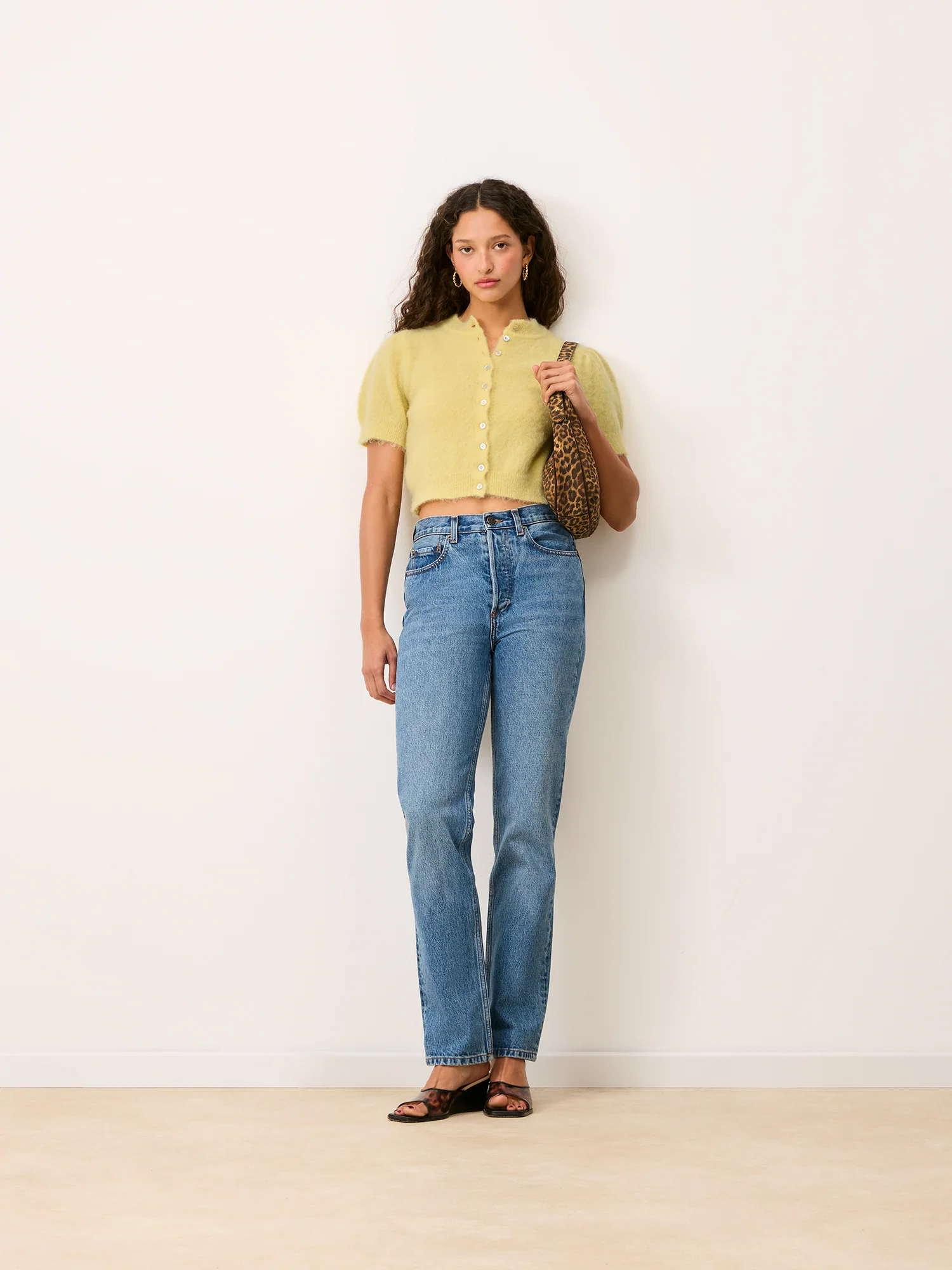 Jaune citron Encolure ronde Manches courtes ballon Bouton en nacre véritable Coupe courte Conçu à Paris Fabriqué en Italie