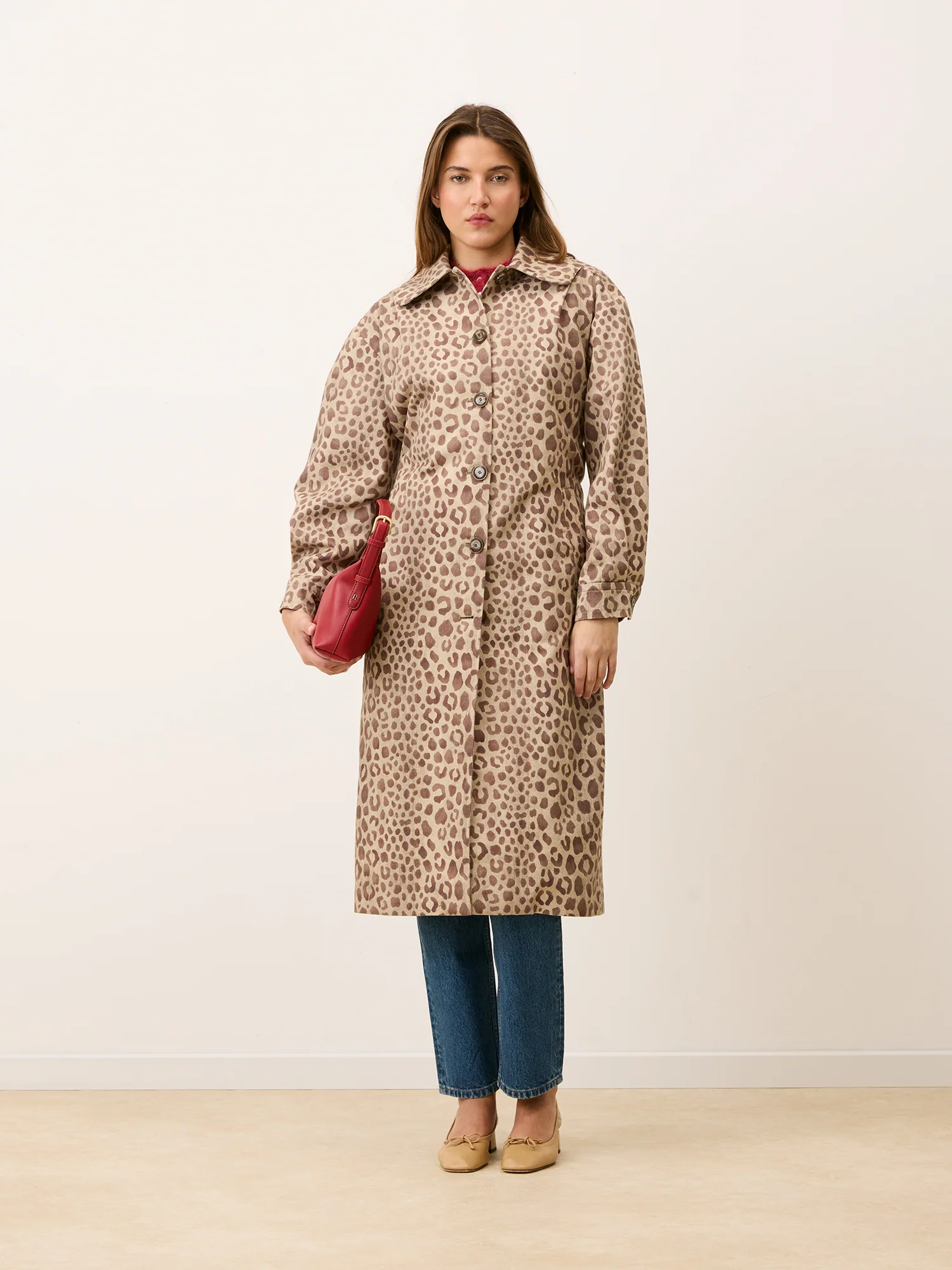 Imprimé léopard Savana Manches longues Plis plats aux épaules Poignets froncés et boutonnés Ceinture amovible Poches raglan Fente arrière Doublure griffée R Poche intérieure passepoilée avec bouton Conçu et dessiné à Paris Fabriqué en Roumanie