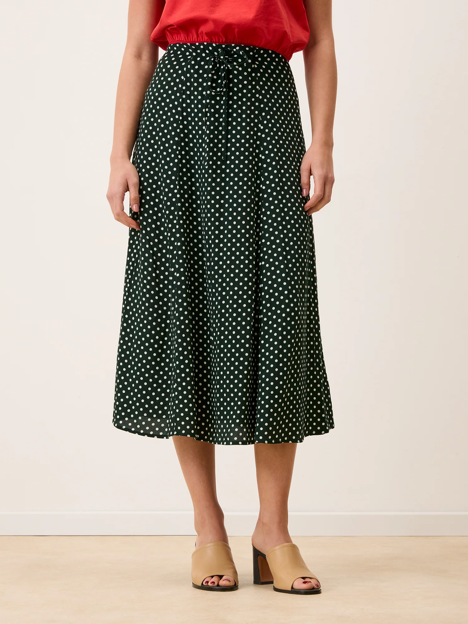 Imprimé à pois verts Pinces à la taille Fermeture éclair invisible dans le dos Lien ajustable sur le côté gauche Conçue et dessinée à Paris Fabriquée au Portugal